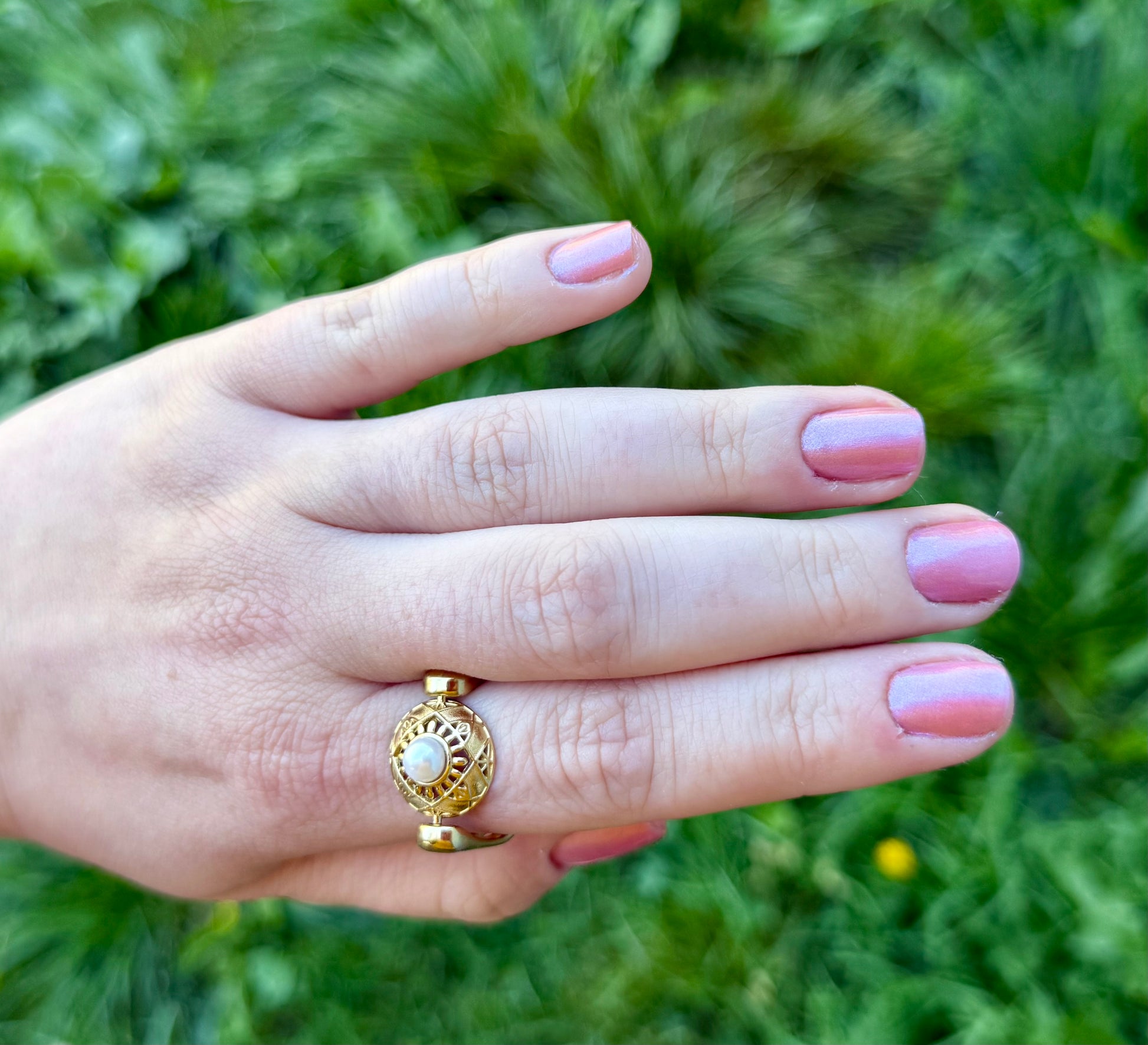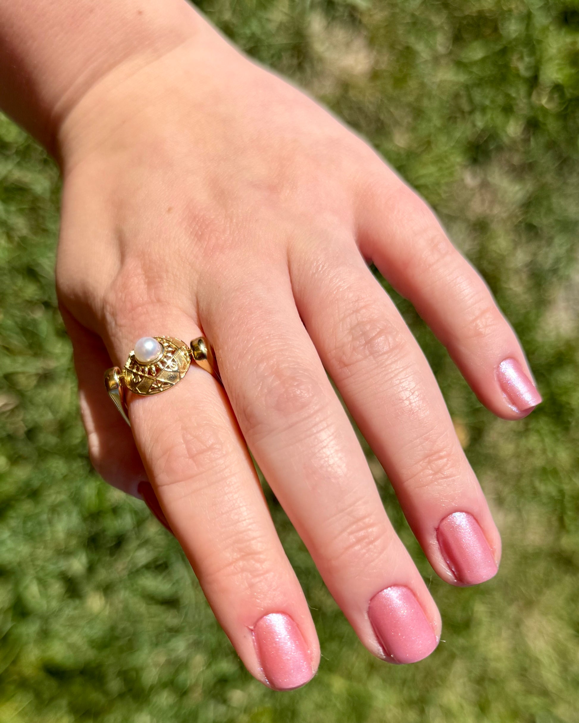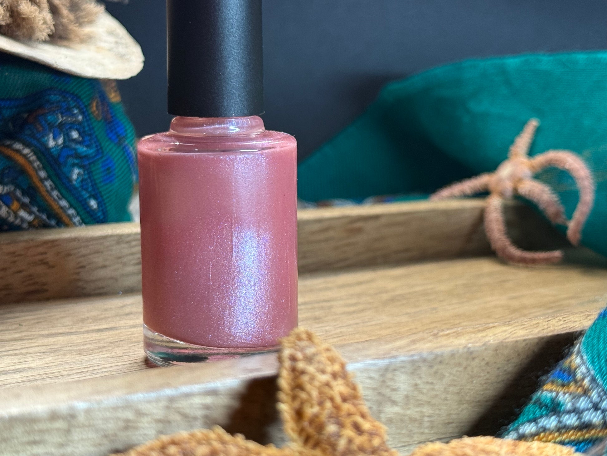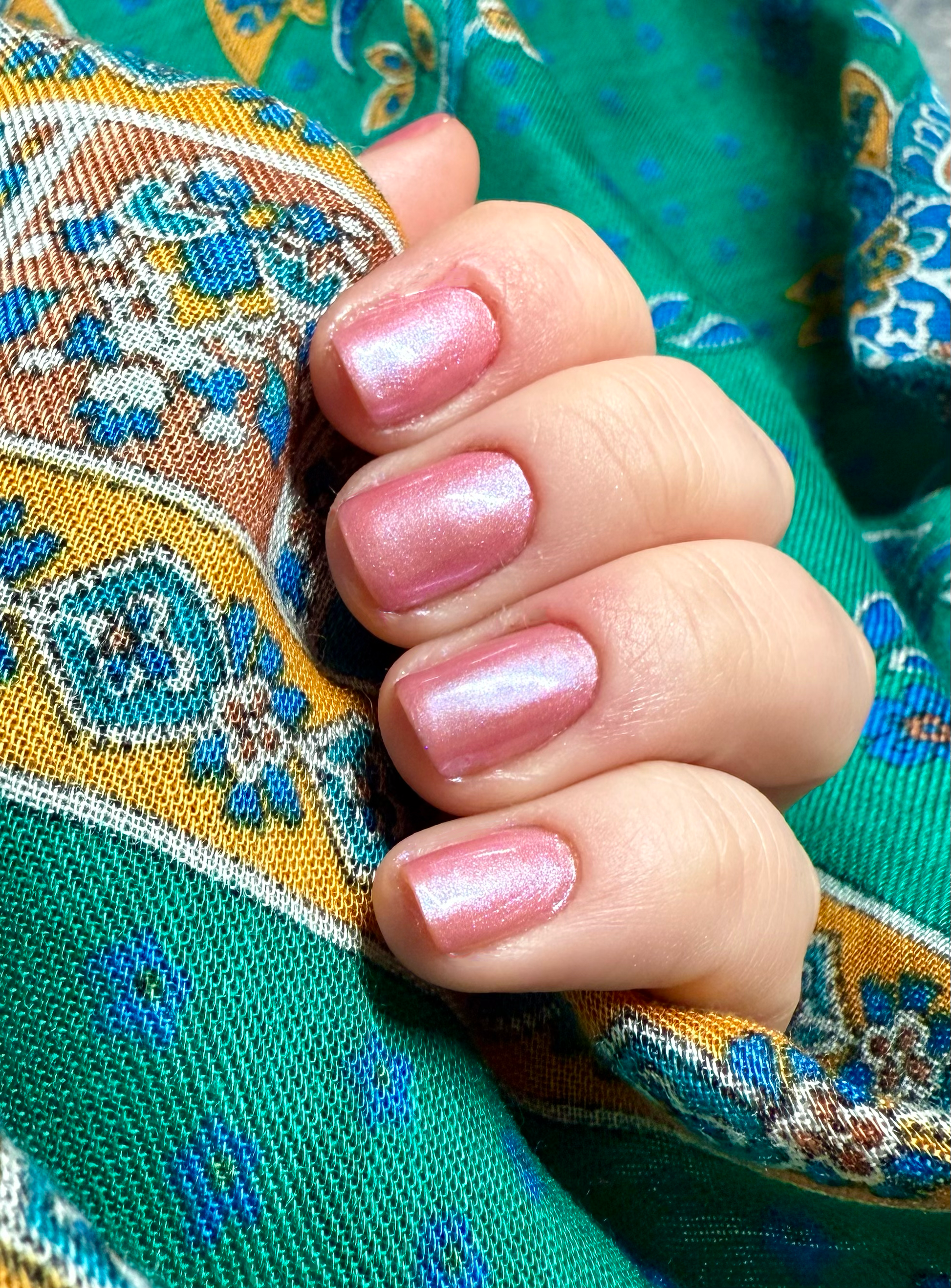 Soft pink-beige with ghostly white shimmer and haunting violet shift