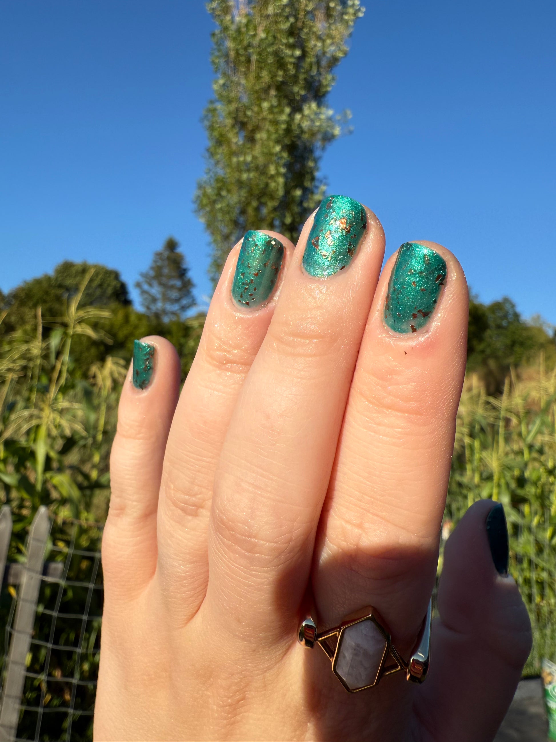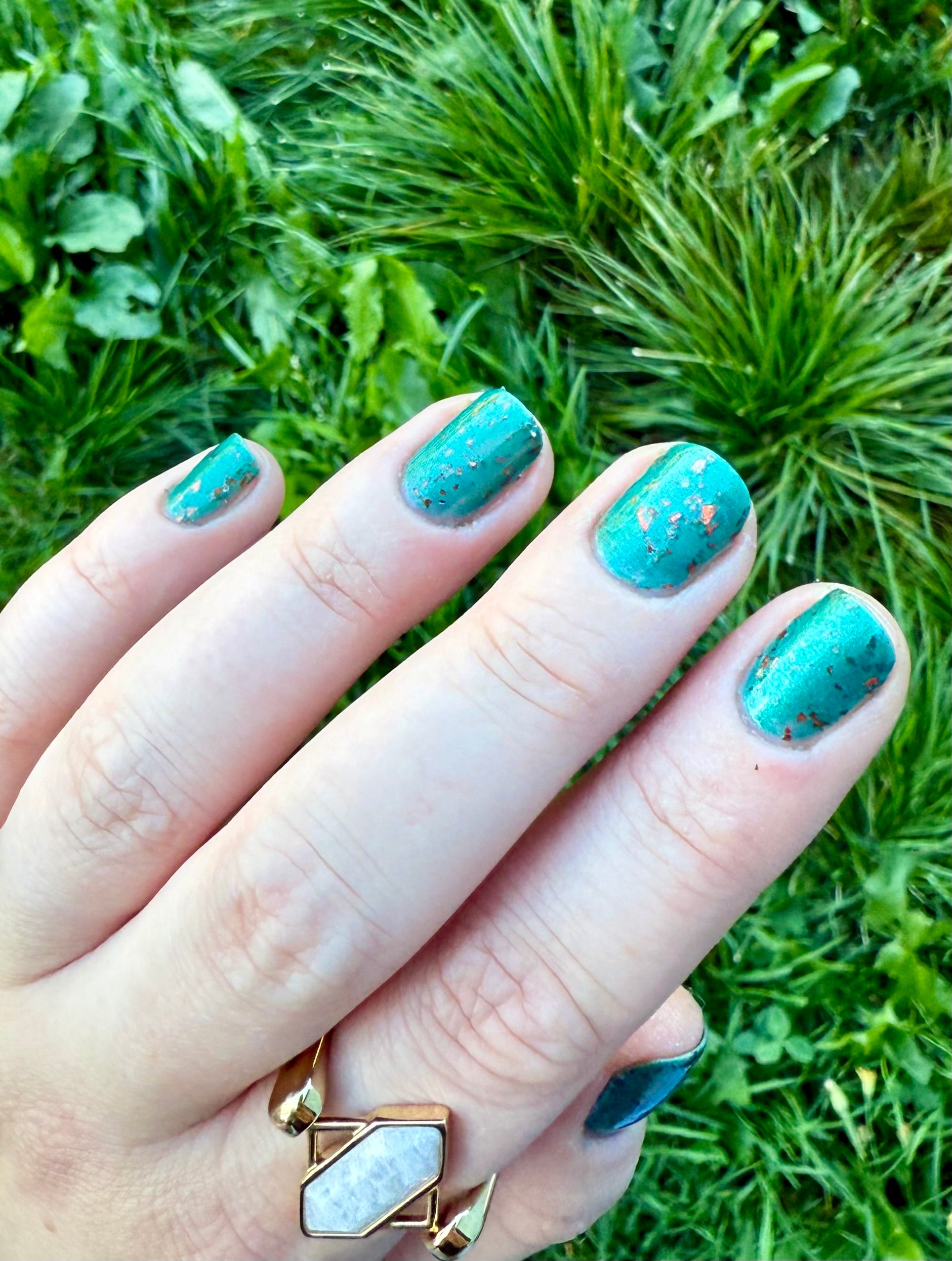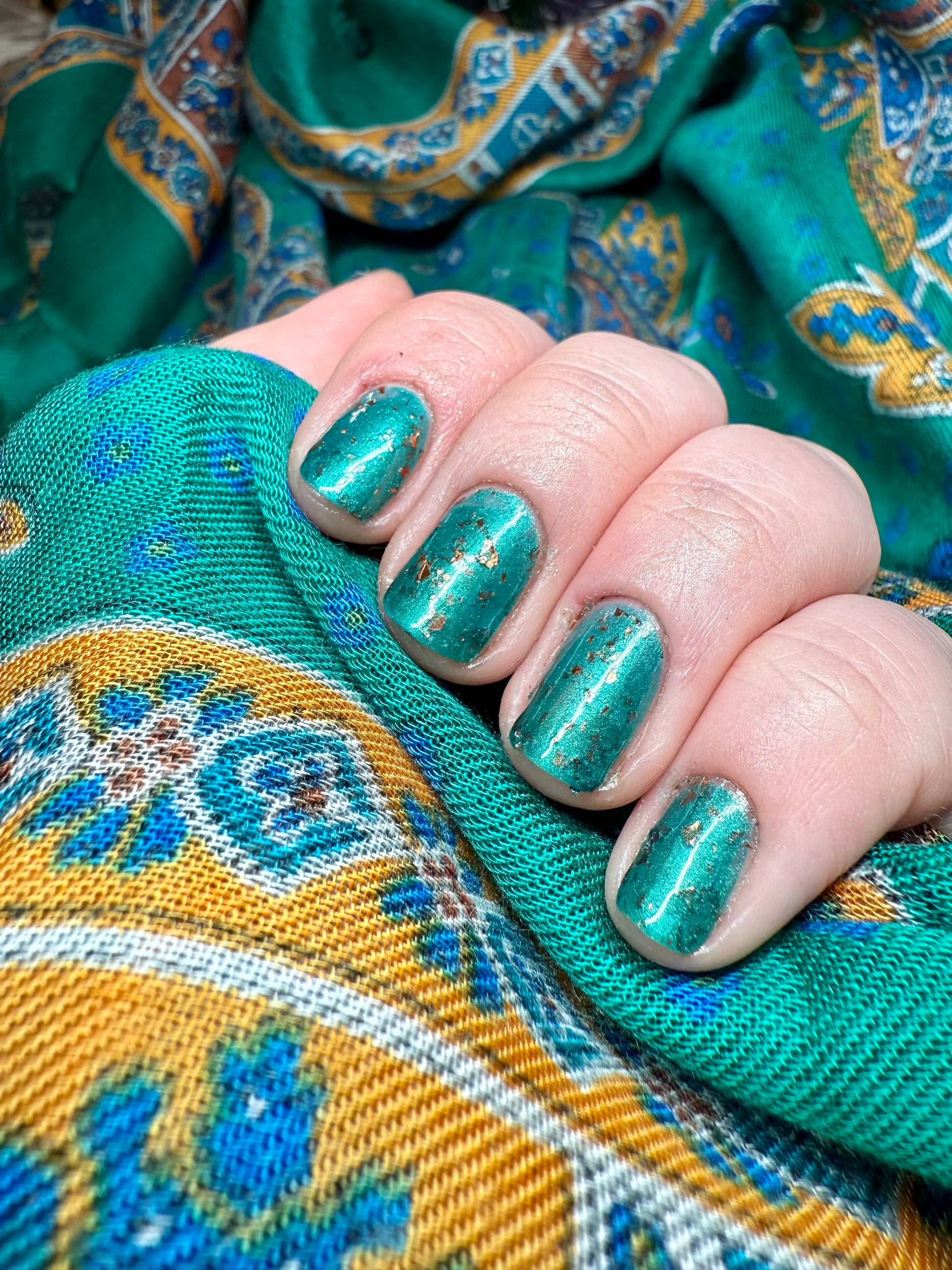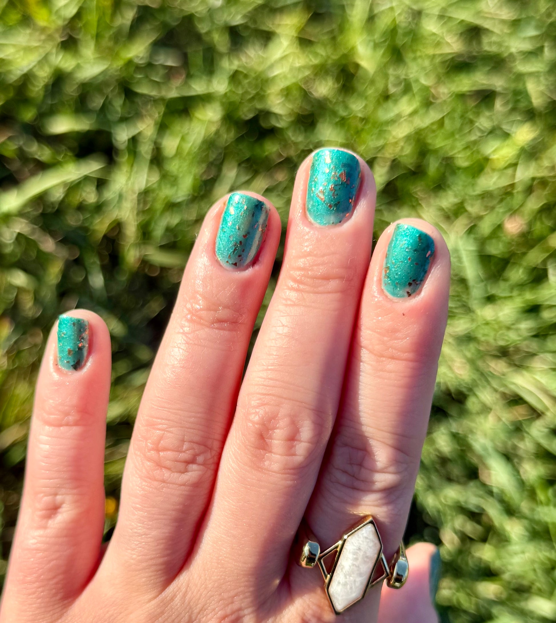 🌊 Origin Tide – A striking turquoise shimmer with bronze flakes from our official hard launch. Like sea glass kissed by sunlight, this polish captures the strength and beauty of Maine’s tides, glowing with warmth and depth.
